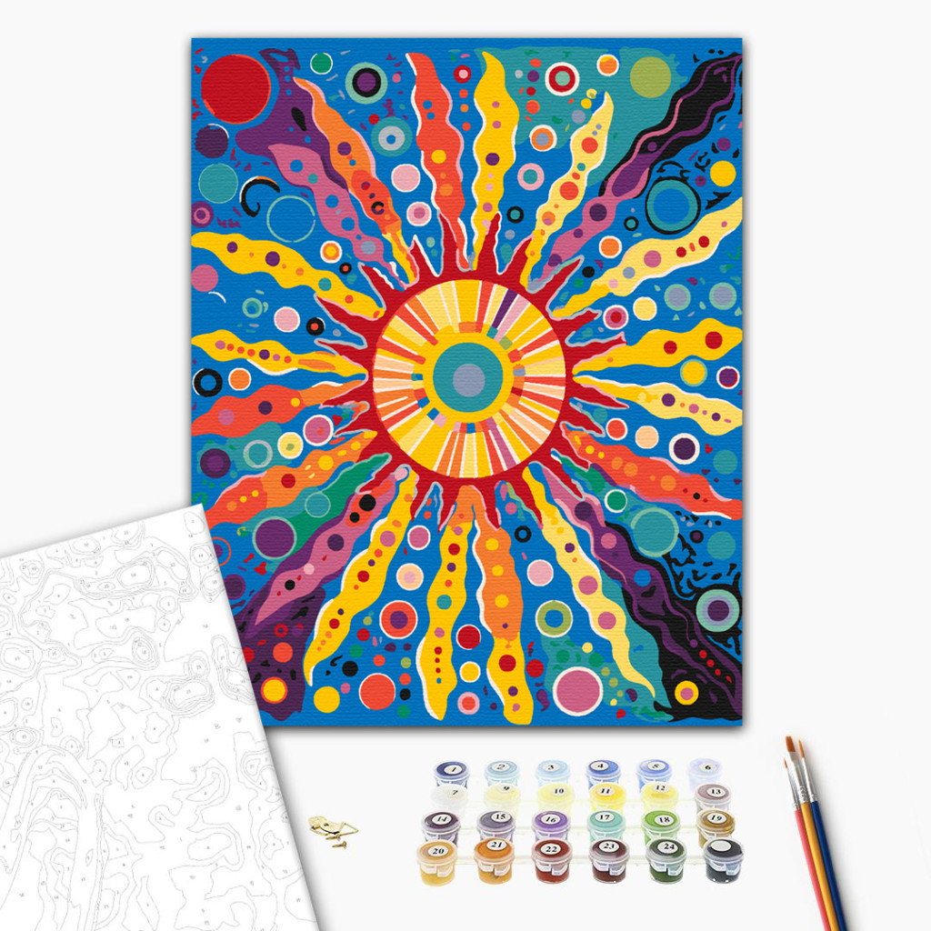 Keretre feszített, számozott kifestőkészlet előrajzolt vászonnal, akrilfestékekkel, ecsettel és segédlettel.