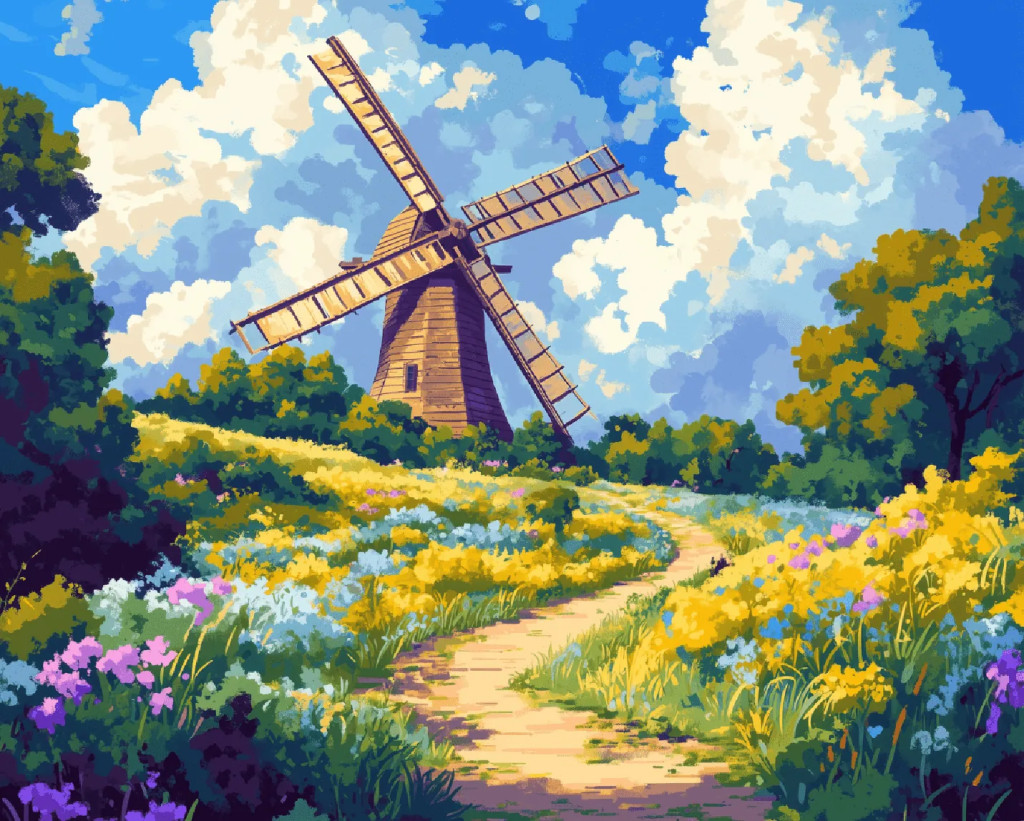 Keretre feszített, számozott kifestőkészlet előrajzolt vászonnal, akrilfestékekkel, ecsettel és segédlettel.