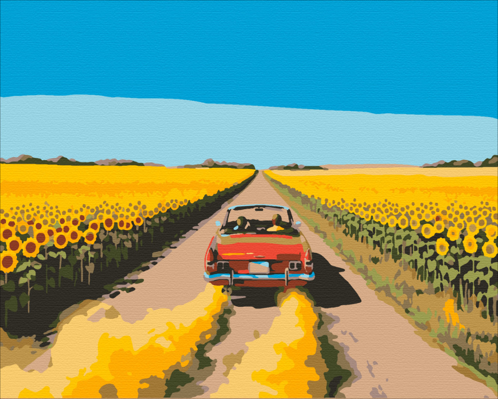 Száguldj bele a nyárba a „Úton a nyárba” számfestő segítségével! Ez a vibráló jelenet egy klasszikus piros kabriót ábrázol, amely egy poros országúton halad a végtelenbe, két oldalán napraforgómezők aranyló tengerével. A ragyogó kék égbolt, a sárga virágok és az út szabadsága a nyári kalandok hangulatát idézik meg. Tökéletes választás mindazoknak, akik szeretik az utazást, a természetet és a gondtalan, napsütötte pillanatokat.