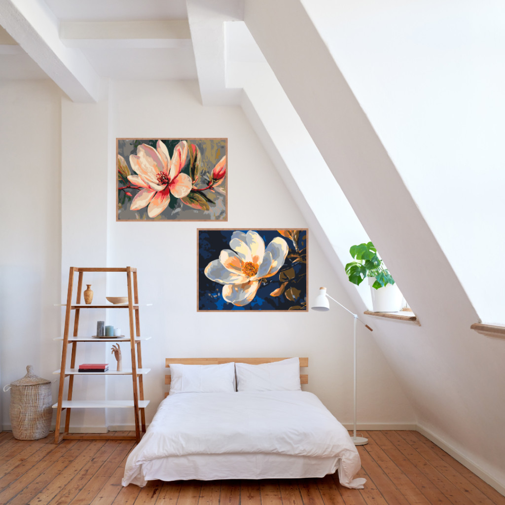 Hozd el otthonodba a tavasz varázsát és a virágzó természet békéjét a „Virágzó Nyugalom” számfestő párossal! Ezek a csodálatos festmények egy-egy nyíló magnóliát ábrázolnak különböző színekben és hangulatban – az egyik meleg, napfényes árnyalatokkal, míg a másik mélyebb, esti tónusokkal. Együtt a kettő tökéletes egyensúlyt teremt: frissességet, eleganciát és természetközeli nyugalmat sugároznak. Kiváló választás hálószobába, nappaliba vagy bármilyen enteriőrbe, ahol szeretnéd a virágos szépséget örök tavaszként megőrizni. Fesd meg ezt a bájos duót, és élvezd a természet ihlette otthoni dekoráció örömét!